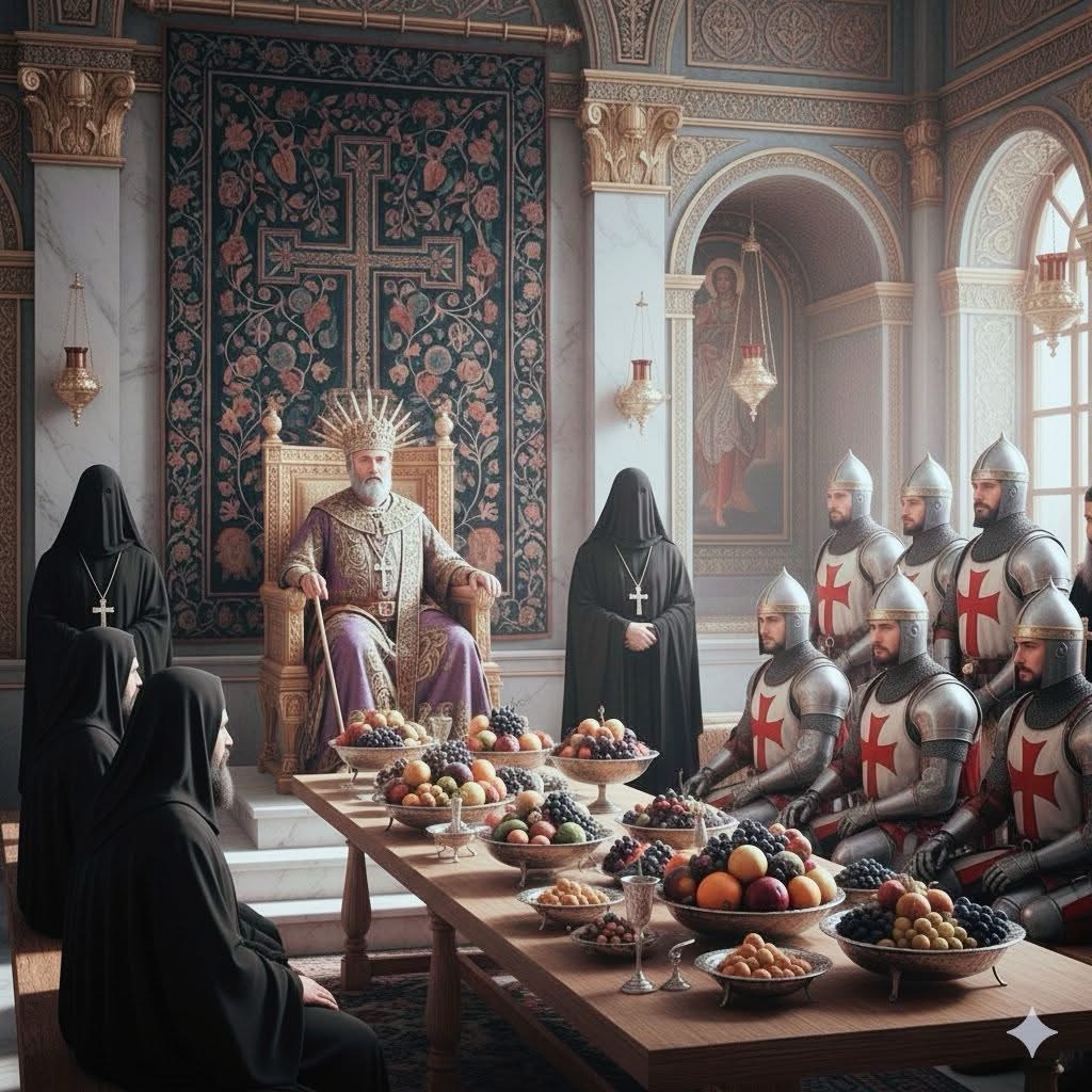 In another corner, Batliq’s brother, the second commander Jirjis, was busy having a crisis meeting with his ego. He couldn’t imagine facing Emperor Heraclius again after such a public failure. His speech to his troops wasn’t motivational—it was desperate.