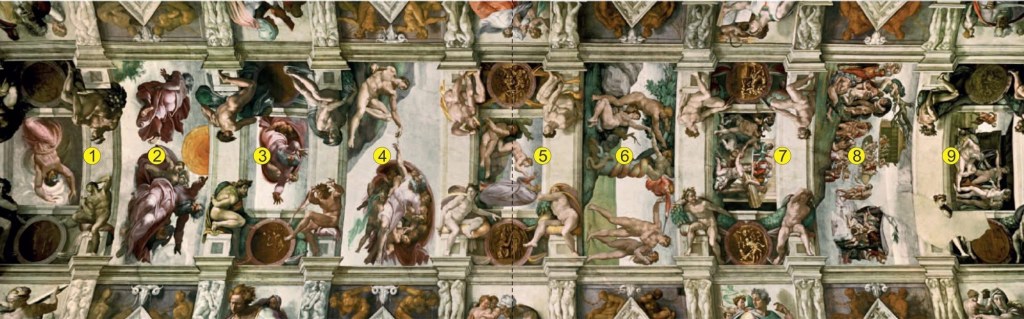 The Sistine Chapel ceiling is structured like a thematic portfolio. Forty-six sections orchestrate a multilayered experience where the side panels narrate stories of biblical prophets, while the central nine panels present a structured storyline of creation, humanity’s fall, and the resilience embodied through Noah’s journey.